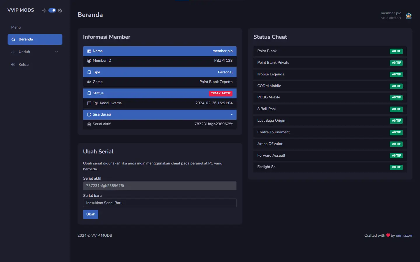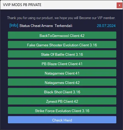 Setiap pembelian di VVIP MODS akan diberikan fasilitas Web Server untuk kemudahan member dalam mendownload tools cheat, file pendukung cheat, dan terutama untuk mengganti serial komputer/HWID saat berpindah PC.
