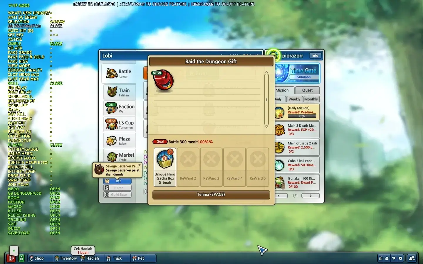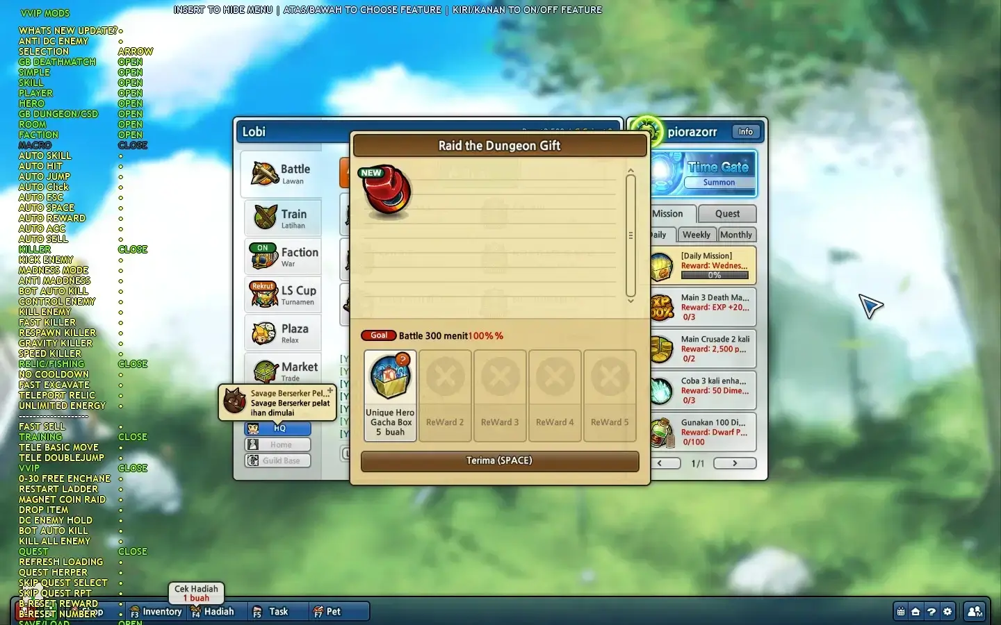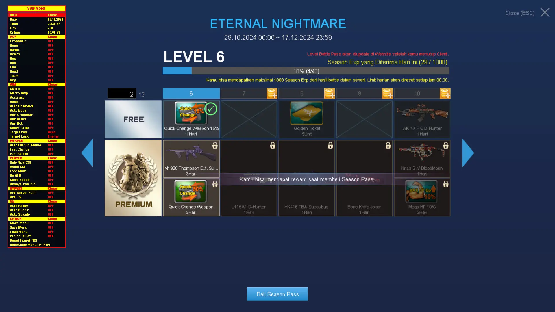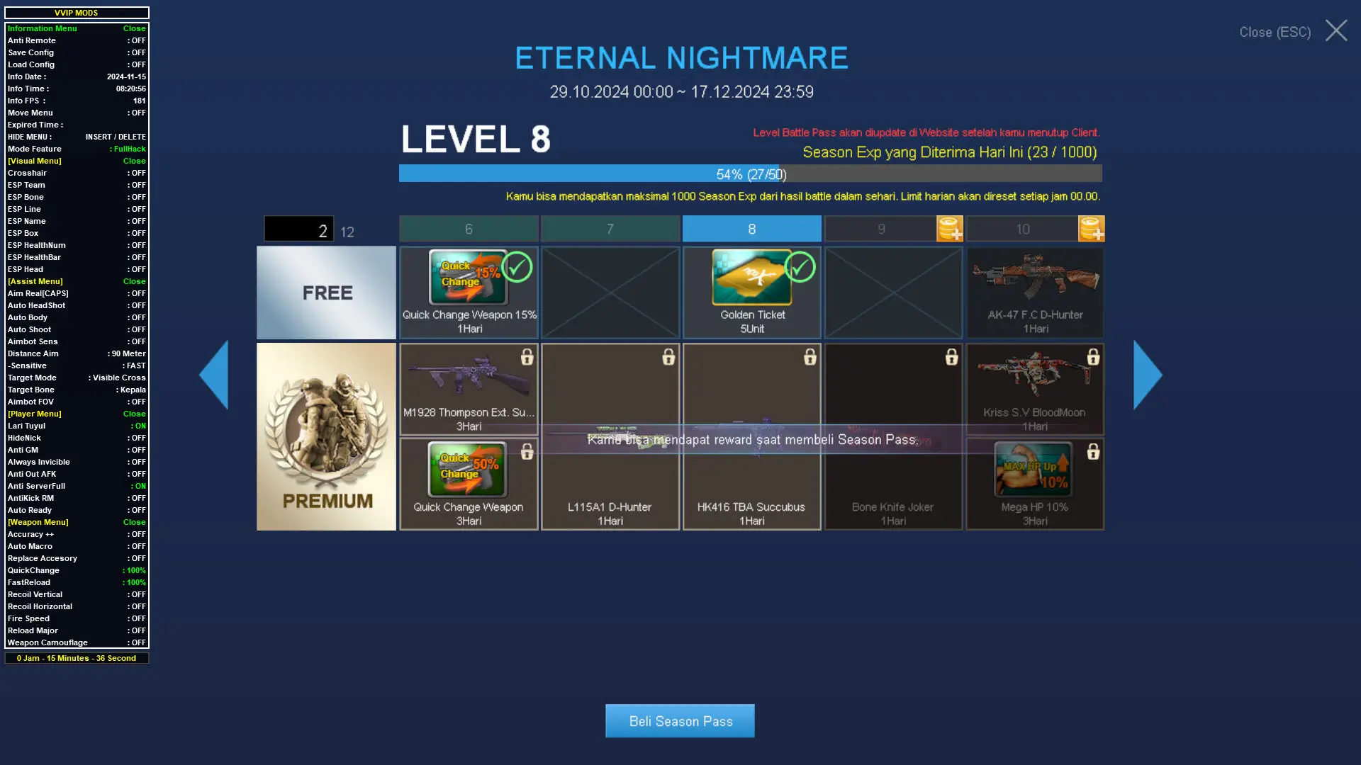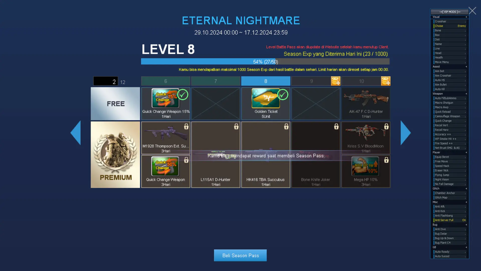 Cheat vip tidak perlu update setiap pergantian hari. Misal kamu order 1 hari di jam 12 siang, besok habisnya juga jam 12 siang, jadi nggak perlu repot" download tiap jam 12 malem.